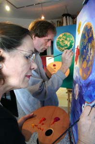 Auf dem blauen Bild mit dem kreisrunden Erdball kommunizieren Gregors ruhige mit Udalrikes unruhigen Strichen. „Trau dich“, ermutigt Udalrike. Gregor zögert. Überlegt. Setzt den Pinsel an: In Zeitlupe berührt sein roter Stern ihre Erde. Jetzt strahlen beide Künstler. Reden geht auch ohne Laute – nur mit Pinsel und Farbe. Rot auf blauem Grund: Damit signieren sie ihr gemeinsames Werk.